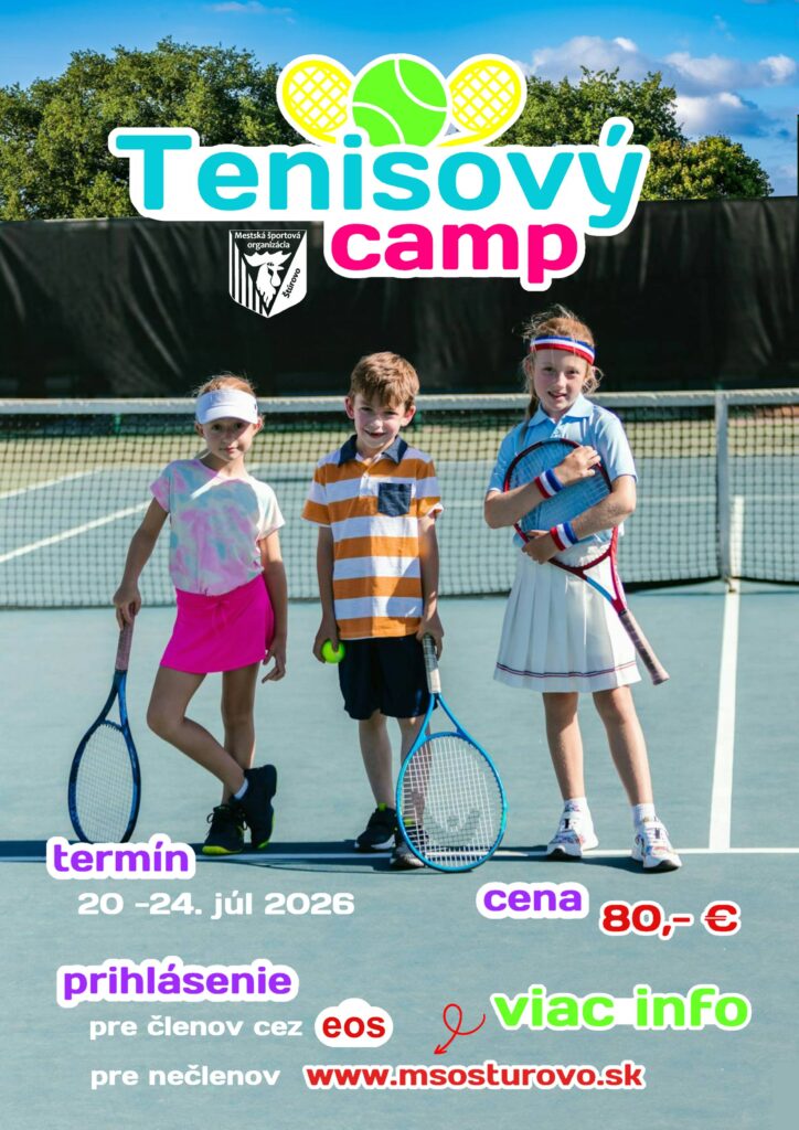 Tábory sú určené pre všetky deti od 5 do 12 rokov, ktoré budú rozdelené podľa veku a tenisovej výkonnosti do skupín. Turnus trvá od 20. 7. do 24. 7. (pon. – pia.) od 8:00 do 16:00 hod. Tábor sa bude konať v priestoroch Tenisového oddielu MŠO Štúrovo, Športová 5.